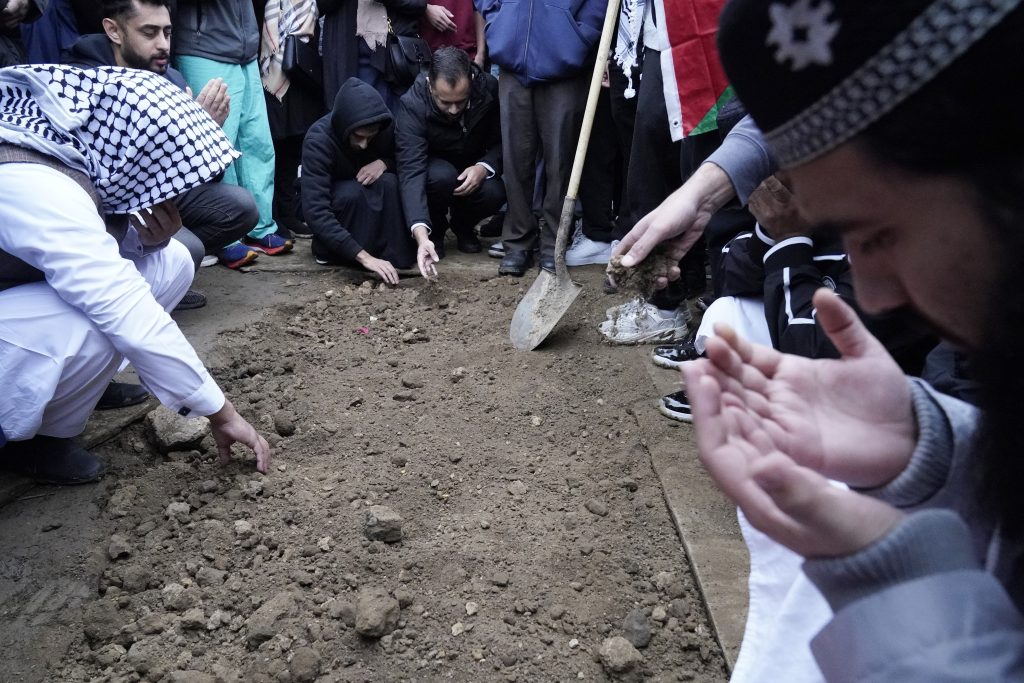 Muslim community members mourn Wadea Al Fayoume at his grave in LaGrange, Ill., Monday, Oct. 16, 2023. An Illinois landlord accused of fatally stabbing the 6-year-old Muslim boy and seriously wounding his mother was charged with a hate crime after police and relatives said he singled out the victims because of their faith and as a response to the war between Israel and Hamas.