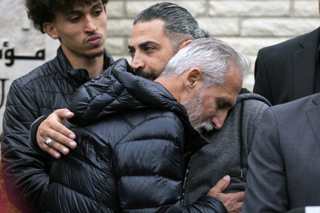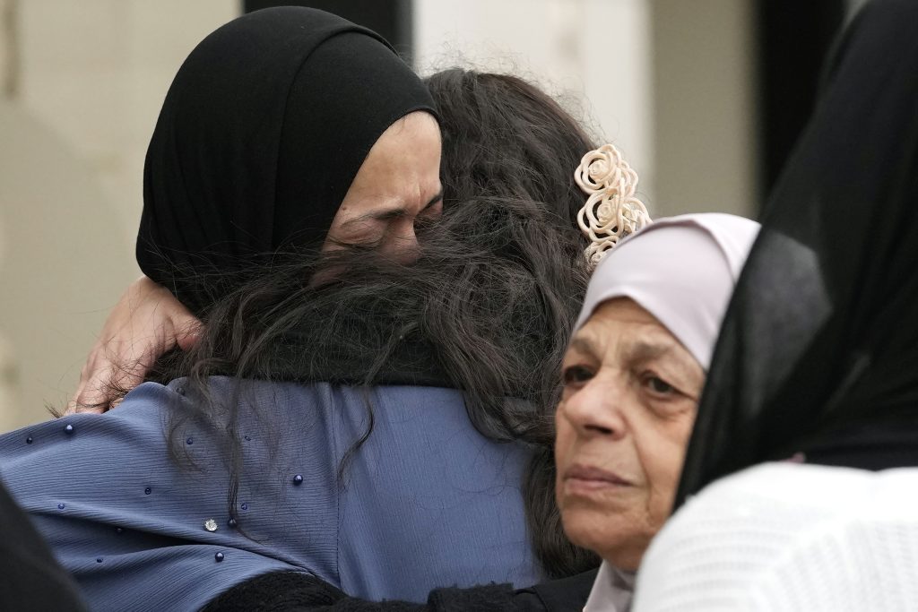 Wadea Al Fayoume's father, Oday Al Fayoume, right, hugs his uncle Mahmoud Yousef, front, during a news conference for Muslim community members at Mosque Foundation in Bridgeview, Ill., Monday, Oct. 16, 2023. An Illinois landlord accused of fatally stabbing the 6-year-old Muslim boy and seriously wounding his mother was charged with a hate crime after police and relatives said he singled out the victims because of their faith and as a response to the war between Israel and Hamas.