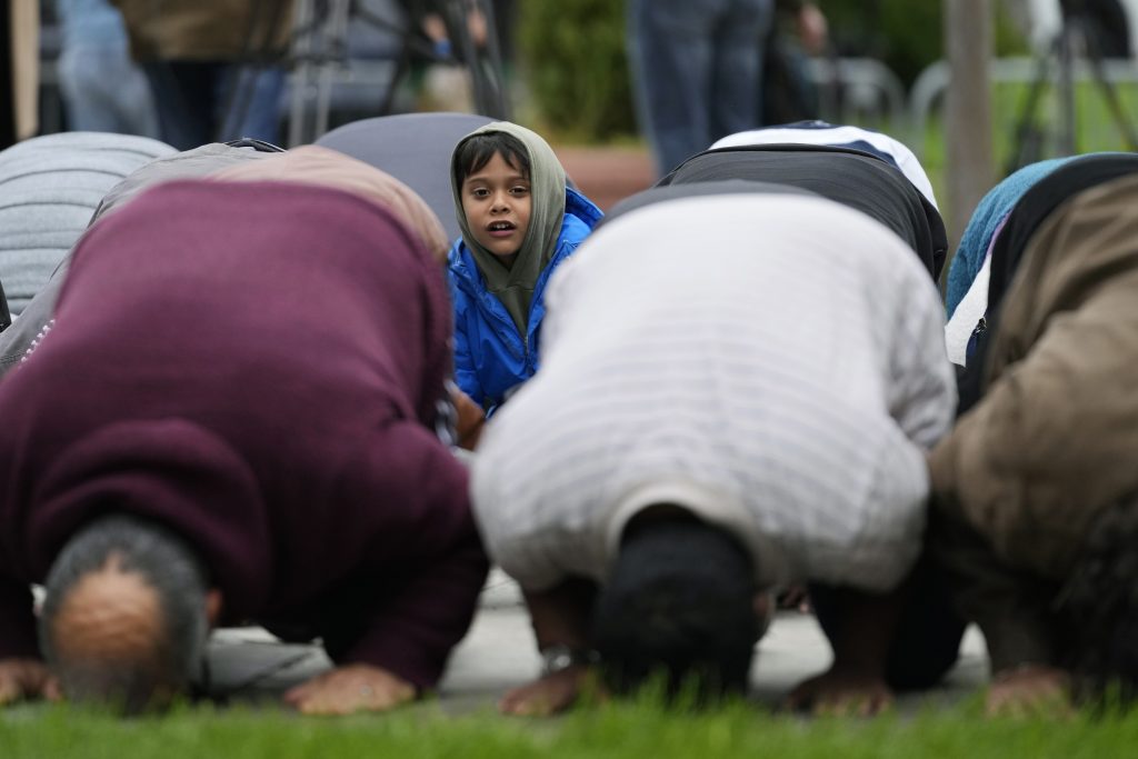 Muslim community members pray for Wadea Al Fayoume at Mosque Foundation in Bridgeview, Ill., Monday, Oct. 16, 2023. An Illinois landlord accused of fatally stabbing the 6-year-old Muslim boy and seriously wounding his mother was charged with a hate crime after police and relatives said he singled out the victims because of their faith and as a response to the war between Israel and Hamas.