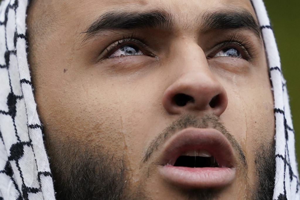 A Muslim community member shouts into the crowd for Wadea Al Fayoume at Mosque Foundation in Bridgeview, Ill., Monday, Oct. 16, 2023. An Illinois landlord accused of fatally stabbing the 6-year-old Muslim boy and seriously wounding his mother was charged with a hate crime after police and relatives said he singled out the victims because of their faith and as a response to the war between Israel and Hamas.