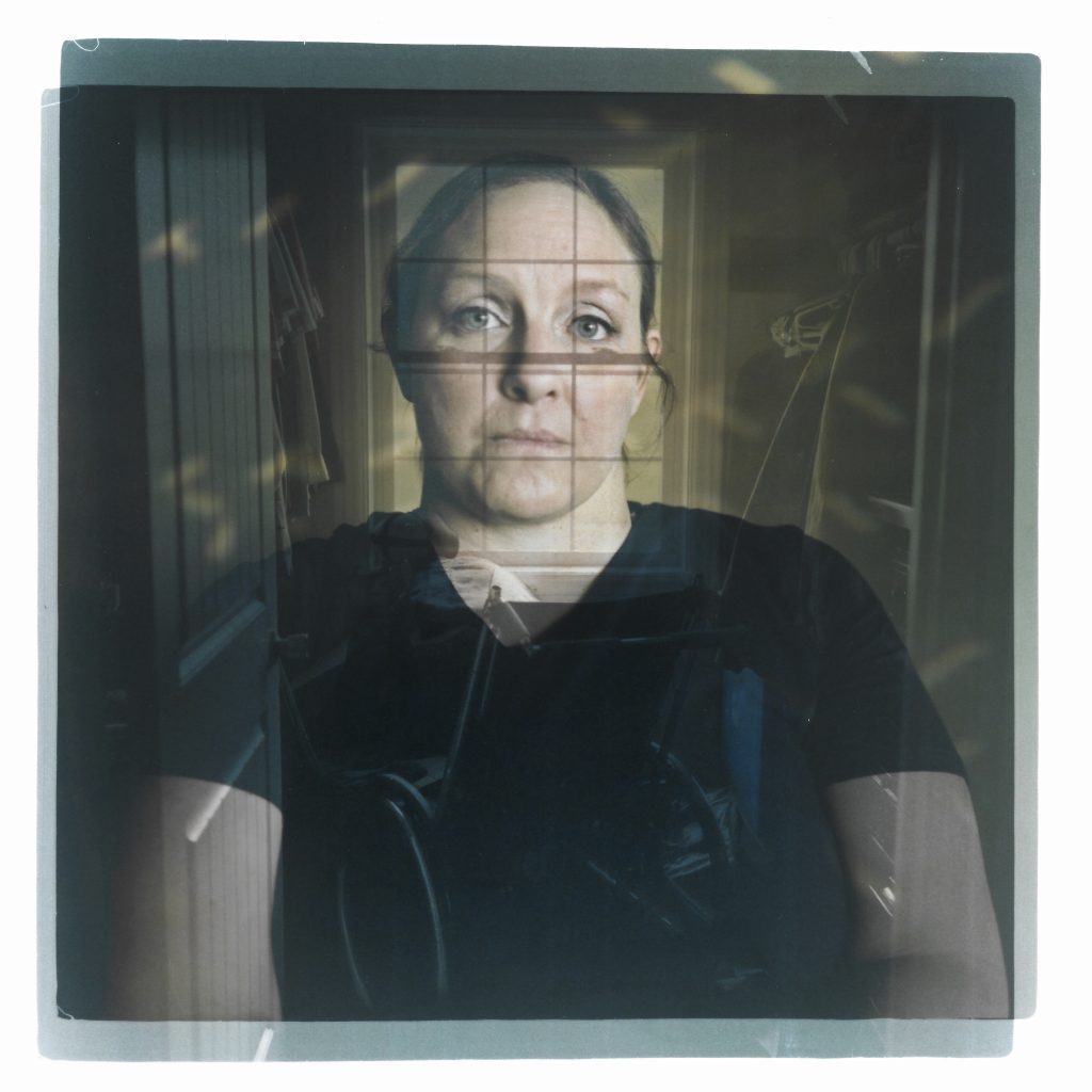 In this double exposure darkroom print made from two film negatives, a portrait of Missy Jenkins Smith, a survivor of a school shooting in 1997 which left her paralyzed, is layered with a photo of her wheelchair she uses for showering as it sits in her closet at her home in Kirksey, Ky., Monday, June 5, 2023. Even after two and a half decades, Jenkins Smith still recalls the moment in exacting detail. That night, she and husband, Josh, had taken their son to Chuck E. Cheese to celebrate his third birthday. On the drive home, he asked, "Mom, why are you in a wheelchair?" Jenkins Smith never had a choice about whether to keep what had happened to her hidden. Paralyzed from the chest down when one of the shooter's bullets severed her spinal cord, she had been honest with herself and others about the injury and the circumstances. In a way, talking about it was like therapy, she says. But that was very different from explaining it to a small child. Her child.