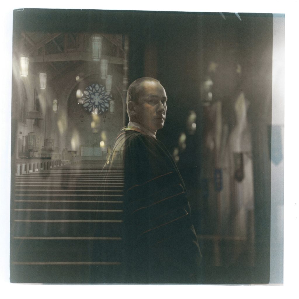 In this double exposure darkroom print made from two film negatives, a portrait of Rev. Stephen Cady is layered with a photo of the sanctuary of Asbury First United Methodist Church where he preaches, Monday, Aug. 21, 2023, in Rochester, N.Y. His church, in a city where 63 people were killed in shootings last year, presides over a leafy neighborhood of carefully kept homes largely bypassed by the violence. But for a congregation unsettled by the increase in mass shootings and the deaths across town that garner far less attention, the way forward would only be darkened by adding even more guns, Cady says. To Cody, the right to bear arms – and the proliferation of 400 million guns and thousands of shootings it has enabled – undermines the freedom to worship in peace. "As a people of faith our adherence is not to the Second Amendment. It's to the Second Commandment, which is 'Love your neighbor as yourself," he says. "And more guns do not help you love your neighbor."