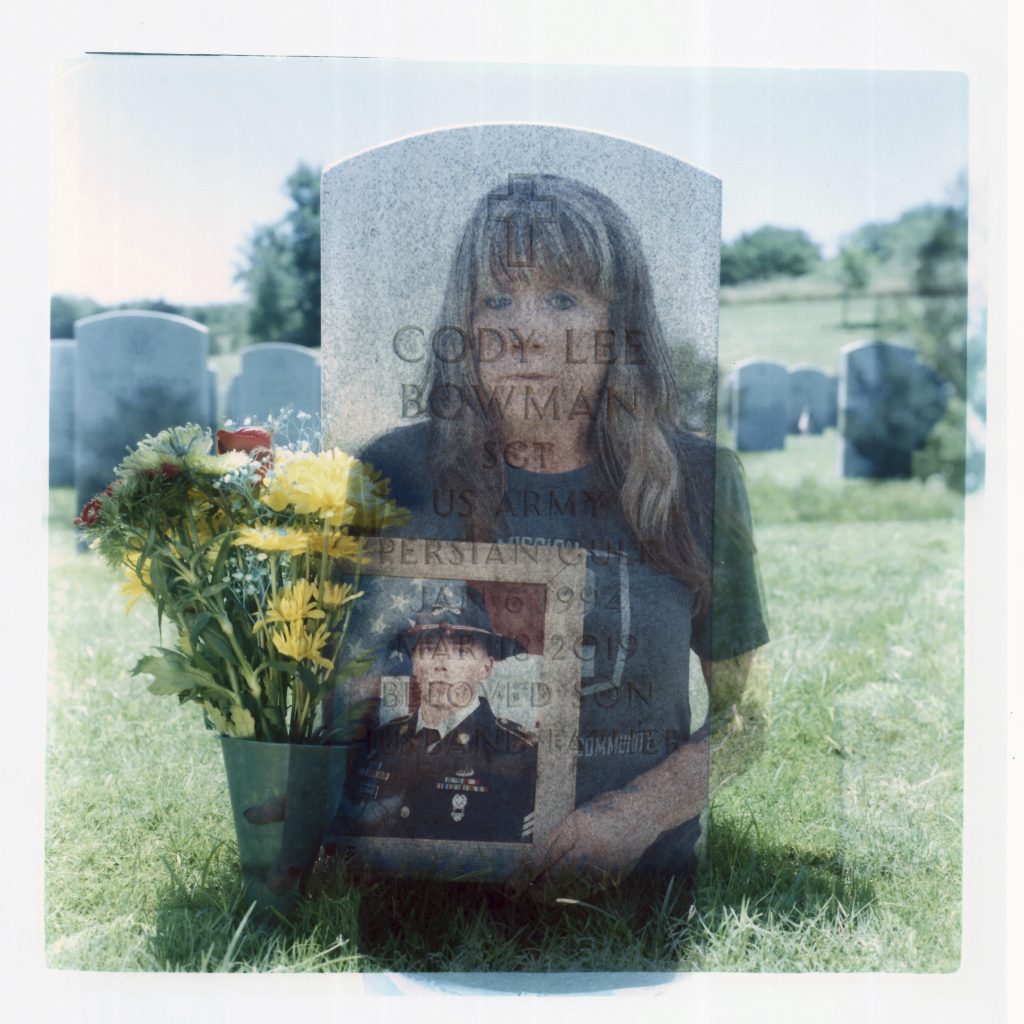 In this double exposure darkroom print made from two film negatives, a portrait of Barbie Rohde holding a photo of her son, Army Sgt. Cody Bowman, is layered with a photo of his tombstone at the Dallas-Fort Worth National Cemetery, Sunday, June 11, 2023, in Dallas. For decades, discussions of suicide prevention skirted fraught questions about firearms; the Army has punted implementing measures that might be controversial. But a growing movement has taken hold, among researchers, the Veterans Administration, ordinary people like Rohde: if this country wants to get serious about addressing an epidemic of suicide, it must find a way to honor veterans and active-duty military personnel, respect their rights to own a gun, but keep it out of their hands on their darkest days. She had been worried about her son. Most of his hand had been blown off in a training accident. He told his mom he didn't know if he could continue his military career, and all he'd ever wanted to be was a soldier. He asked for his guns, which she had been holding. She'd hesitated. But they were his, and this is Texas. Then the military officers said: "Your son Sgt. Cody Bowman died of a self-inflicted gunshot wound." "And I really don't remember the rest of the day," Rohde said. "I just sat on the floor and screamed." She didn't eat for six days. She decided she wanted to be with her son. "I'm glad I didn't have a gun. Because if I would have had a gun, I believe I'd have finished the job. I need to be here, I still have a lot to do," she said. "And I wish Cody wouldn't have had a gun."