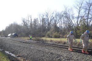 A train car overturned in Upper Tyrone Township Thursday afternoon, causing about 200 gallons of a flammable liquid to spill into a tributary of Jacobs Creek, officials said.The accident occurred near the intersection of Broadford and Woods roads at about 1 p.m. There was no danger to ...