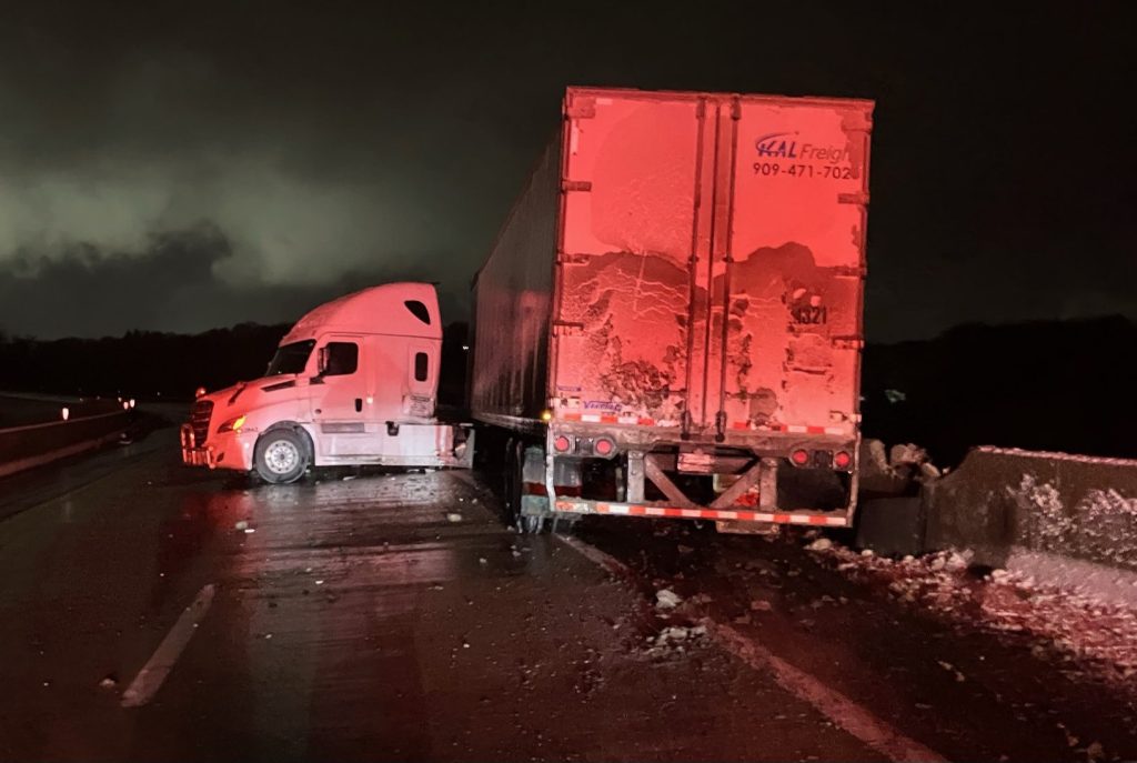 Tractor-trailer crash on flyover ramp sends concrete debris onto I-70 below