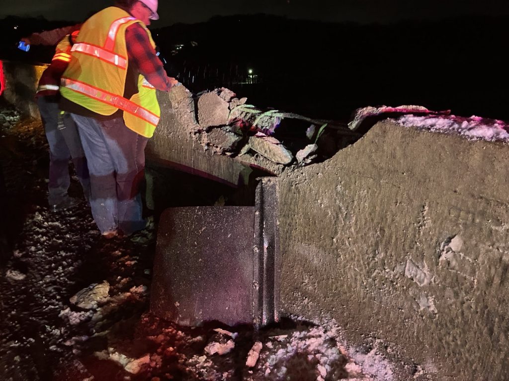 Firefighters were able to request the state Department of Transportation dispatch a plow truck to literally scrape the chunks of concrete off I-70 in order to keep traffic moving in the westbound lanes.