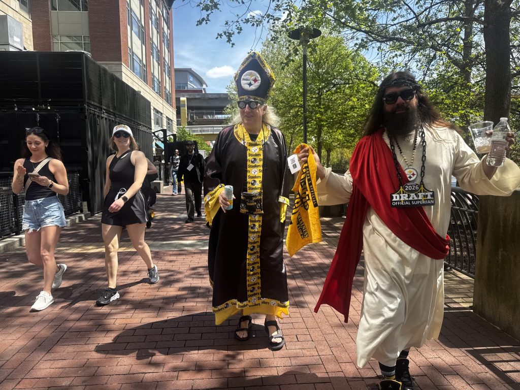 Pope Yinzer (Don Zadach of Finleyville) and Steeler Jesus (Sean Steinmetz of North Hills) have faith that their Black and Gold will draft the right players. [Karen Mansfield]