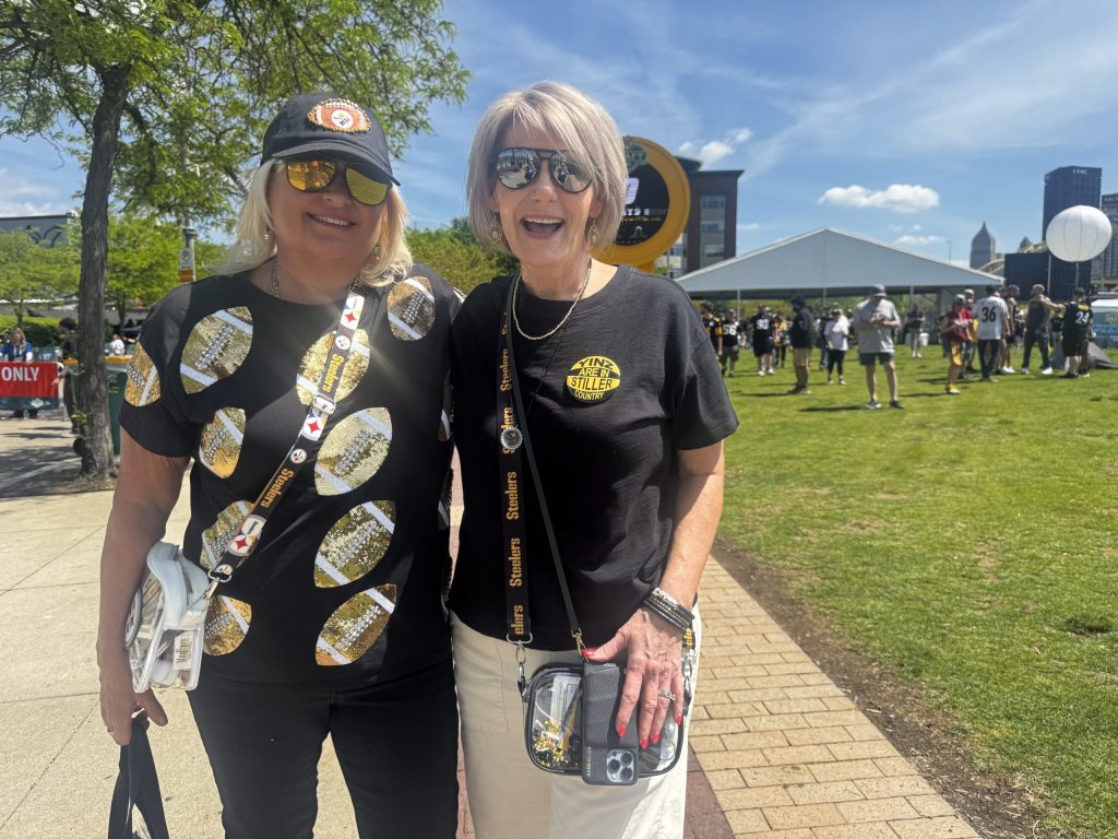 Jill Barletti and Sue Richards sport their black and gold on Thursday at the NFL Draft. The New Castle women are Steelers season ticket holders. [Karen Mansfield]