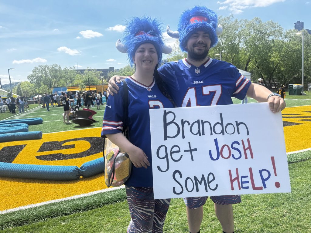 Victoria and Dominik Rettberg of Buffalo, N.Y., want the Buffalo Bills' general manager, Brandon Beane, to get QB Josh Allen a little help. [Karen Mansfield]