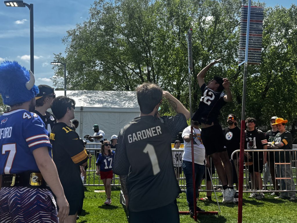 A fan practices a vertical jump on Thursday at the NFL Draft. [Karen Mansfield]