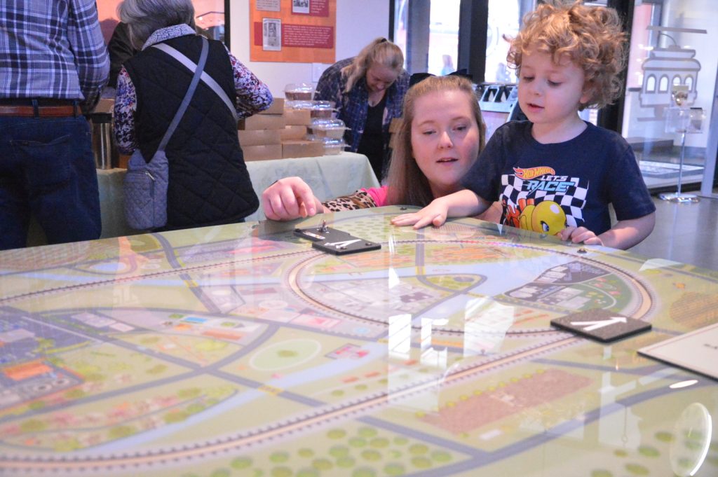Heather Simpkins of Washington helps out Henry Simpkins, 3, switch trains at a Pennsylvania Trolley Museum exhibit. [Garrett Neese]