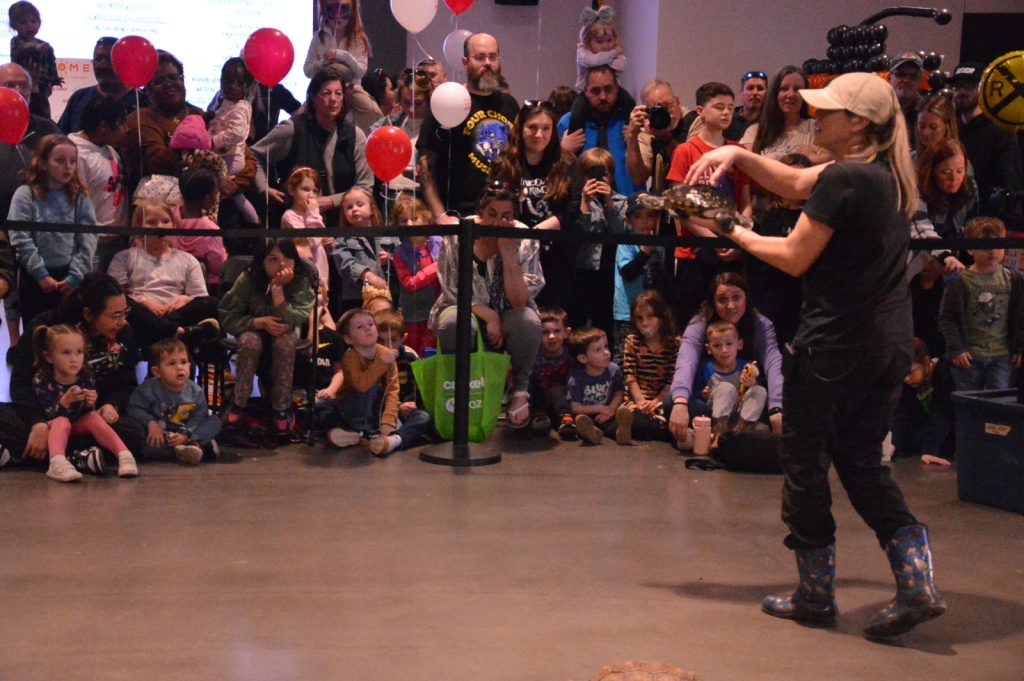 Jamie Kemmerer of Bentleyville explains the difference between a turtle and a tortoise in front of a packed crowd for her Wild World of Animals show at Kids Fest. [Garrett Neese]