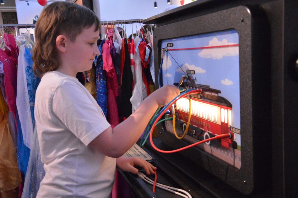 Jaxon Dzinglski, 9, of Wheeling, W.Va., tries out the Pennsylvania Trolley MuseumĢƵ circuit station exhibit. [Garrett Neese]