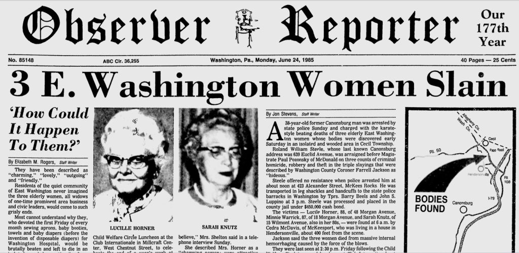 Lucille Horner, 88; Minnie Warwick, 86; and Sarah Kuntz, 85, were brutally murdered during the summer of 1985. Roland William Steele, 38, of Canonsburg, was eventually convicted of three counts of first-degree murder for their deaths, along with robbery and theft. He was sentenced to three separate death sentences.