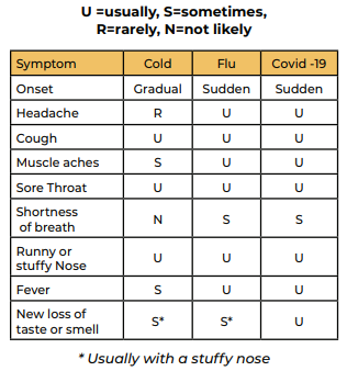 As you can see from above, distinguishing between these illnesses based on symptoms alone is difficult. In general, common cold symptoms tend to be less severe and come on more gradually, but Covid 19 and flu can both present with mild symptoms. You can contact your healthcare provider or visit, and urgent care center and they can determine if it would be appropriate for you to receive testing for these viruses.
