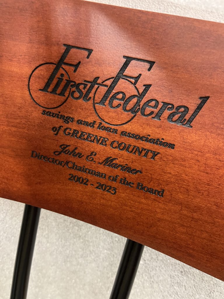 In addition to the reception and Director Emeritus title, one more surprise was in store for Mariner. He was presented with his own personalized rocking chair in which to sit and enjoy his second and last retirement from First Federal of Greene County.