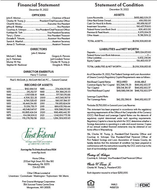 “Considering inflation reached a 40-year high, consumers felt the exorbitant increase in the cost of consumer goods, notably fuel, food and other necessities,” wrote Charles W. Trump, Jr., President/CEO of First Federal of Greene County, in his annual PresidentĢƵ Report. “Each year brings its own unique and special challenges, and this past year was no exception.”
