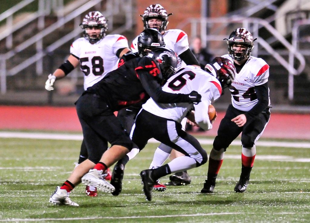 Mohawk answered quickly. Nick Wheeler found Dmitry Pendro open deep down the right sideline for a 65-yard gain on third and 18 to the Cougars 16. Braydon Cameron covered that in two runs, the second from five yards out for the score. Dylan LloydĢƵ extra point was wide, leaving the fifth-seeded Warriors (9-3) down 7-6 with 8:44 left in the half.