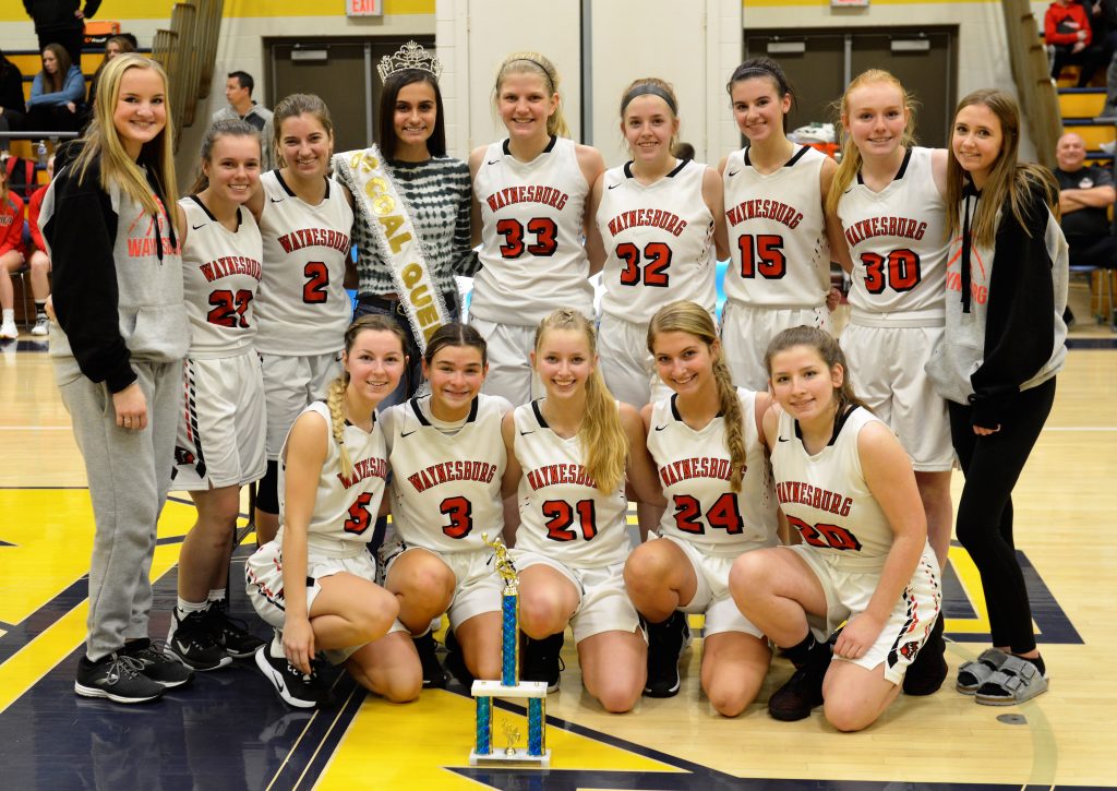 Waynesburg Central players pose with 2019 Coal Queen Lizzie Dulla while displaying the first-place trophy after defeating Frazier, 44-25, in the Carmichaels Lions Club King Coal Christmas Tournament girls championship game on Saturday. (Photo by Rob Burchianti)