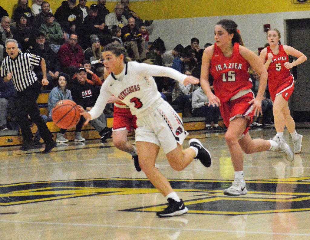 Waynesburg CentralĢƵ Nina Sarra heads toward the basket after coming up with a steal against Frazier during the Carmichaels Lions Club King Coal Christmas Tournament girls championship game on Saturday. Sarra scored 11 points in the Lady Raiders’ 44-25 victory.