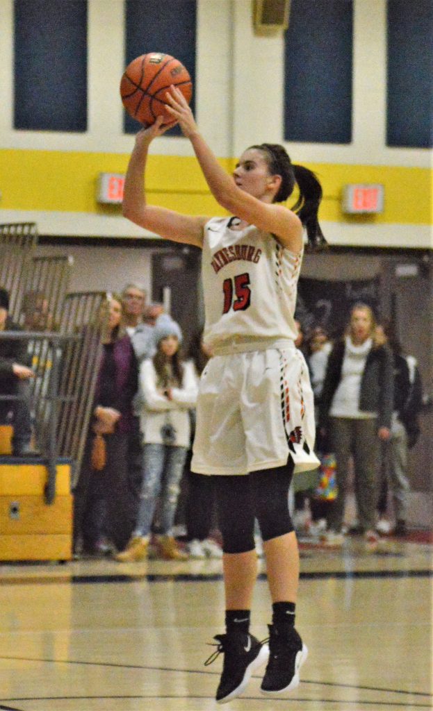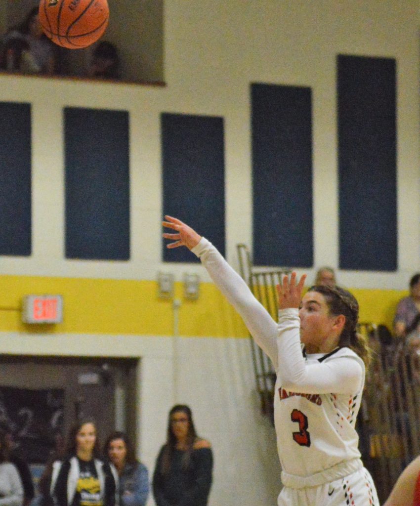 Waynesburg Central's Nina Sarra hits a 3-pointer against Frazier during the Carmichaels Lions Club King Coal Christmas Tournament girls championship game on Saturday. Sarra scored 11 points in the Lady Raiders' 44-2 victory.