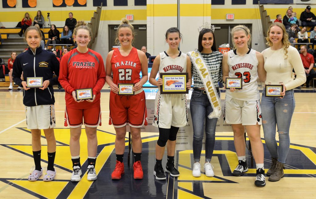 Members of the Carmichaels Lions Club King Coal Christmas Tournament all-tournament team pose with 2019 Coal Queen Lizzie Dulla on Saturday. Pictured are (from left) Sophia Zalar of Carmichaels, Kaelyn Shaporka and Sierra Twigg of Frazier, tournament MVP Jules Fowler of Waynesburg Central, Dulla, Clara Paige Miller of Waynesburg Central and Kylie Sinn of Carmichaels. Propel Montour's Kahrjah Washington also was a member of the team.