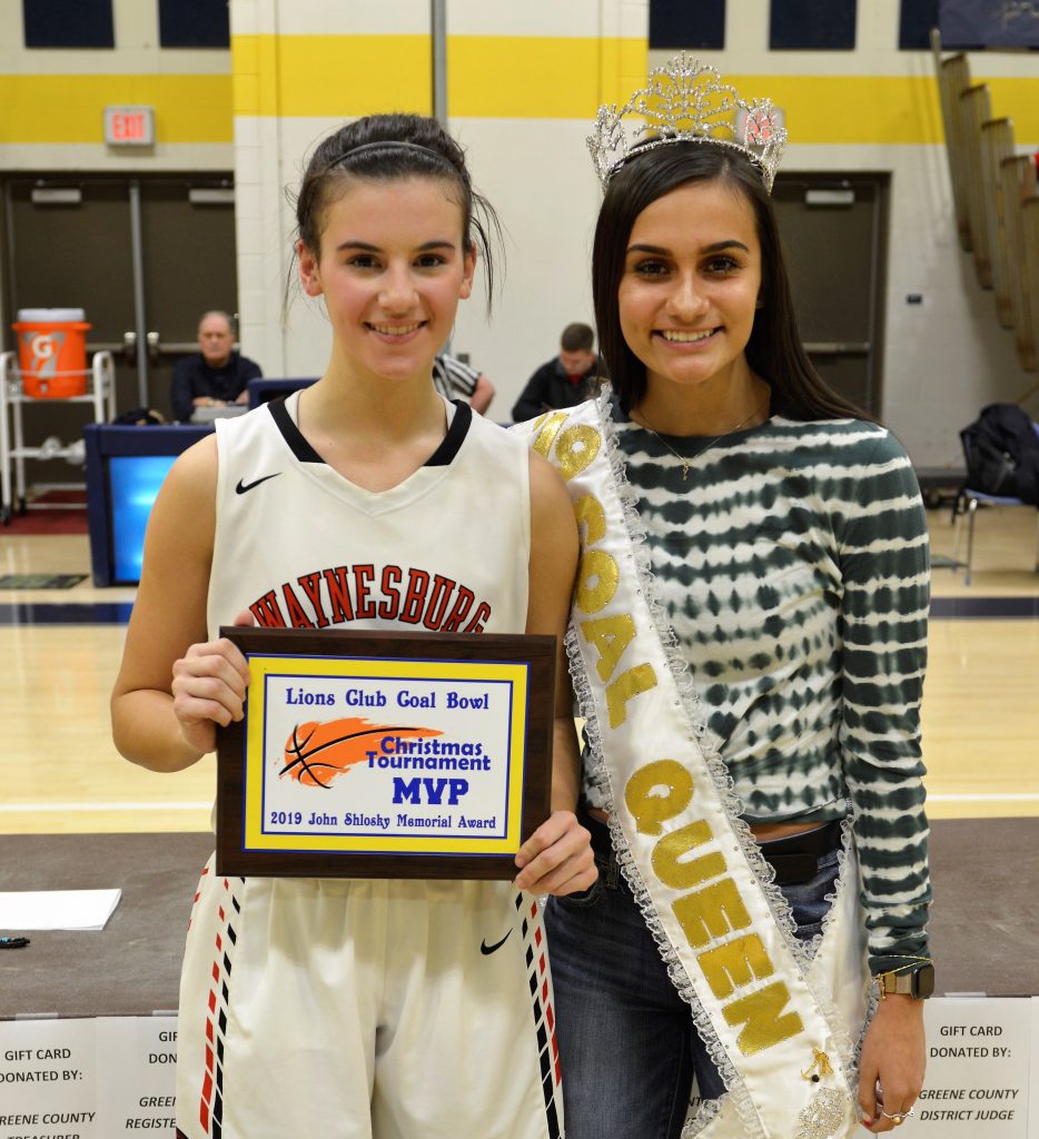 Waynesburg Central's Jules Fowler displays the plaque she was awarded for being selected as Carmichaels Lions Club King Coal Christmas Tournament girls MVP while standing next to 2019 Coal Queen Lizzie Dulla on Saturday.