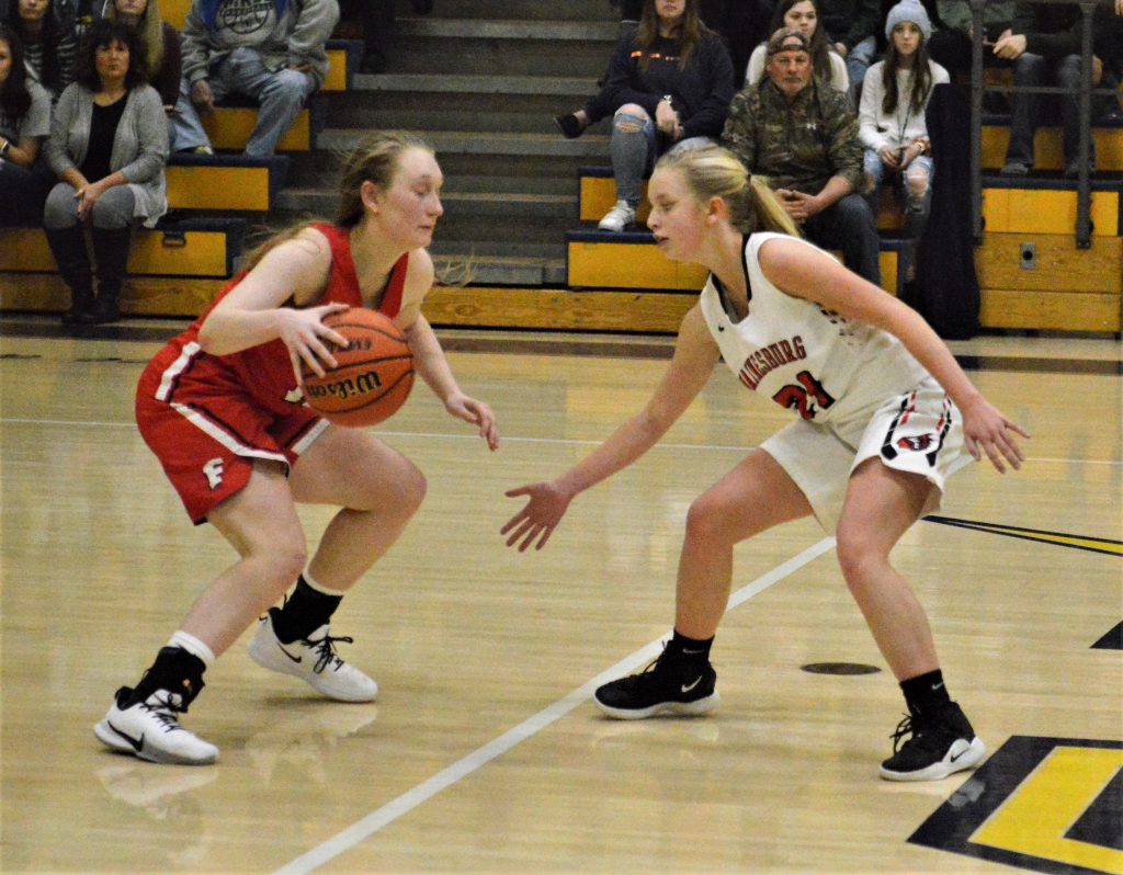 FrazierĢƵ Kaelyn Shaporka dribbles up court as Waynesburg CentralĢƵ Brenna Benke defends during the Carmichaels Lions Club King Coal Christmas Tournament girls championship game on Saturday.
