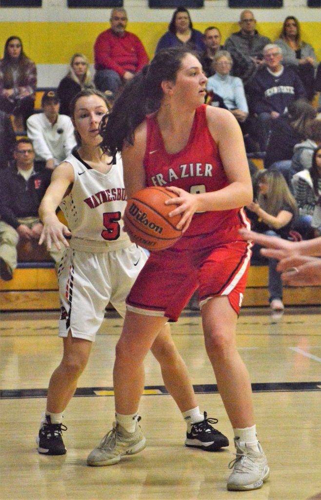 Frazier's Eliza Newcomer looks for a teammate to pass to after pulling down a rebound against Waynesburg Central during the Carmichaels Lions Club King Coal Christmas Tournament girls championship game on Saturday.