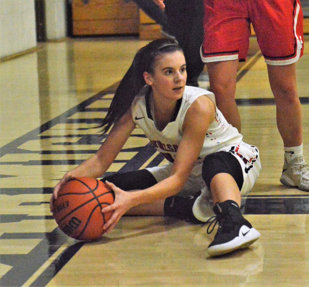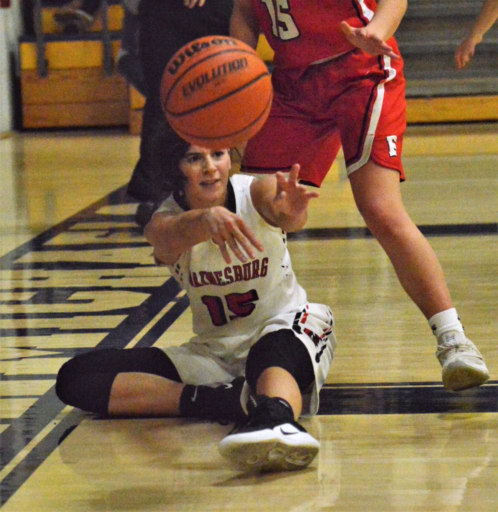 Waynesburg Central's Jules Fowler throw a pass after going to the floor to try to recover a loose ball against Frazier during the Carmichaels Lions Club King Coal Christmas Tournament girls championship game on Saturday.