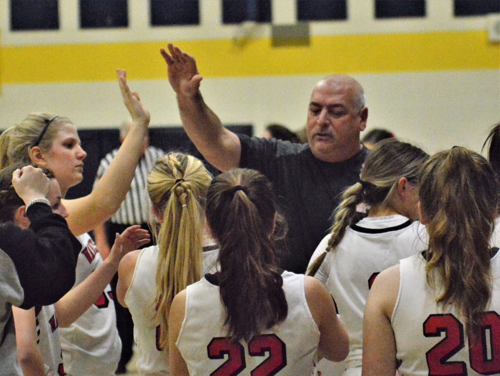 Waynesburg Central coach Dave Sarra breaks a huddle with his players after a timeout during the Carmichaels Lions Club King Coal Christmas Tournament girls championship game against Frazier on Dec. 28, 2019. The Lady Raiders won the tournament. (Photo by Rob Burchianti)