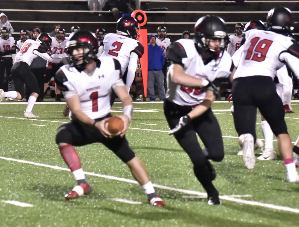 The Warriors outgained the Quips, 124-117, in the first half, and held a 7-6 lead with 43 seconds remaining in the first quarter when Chase Whatton scored on an eight-yard run and Andrew Smith added the extra point.