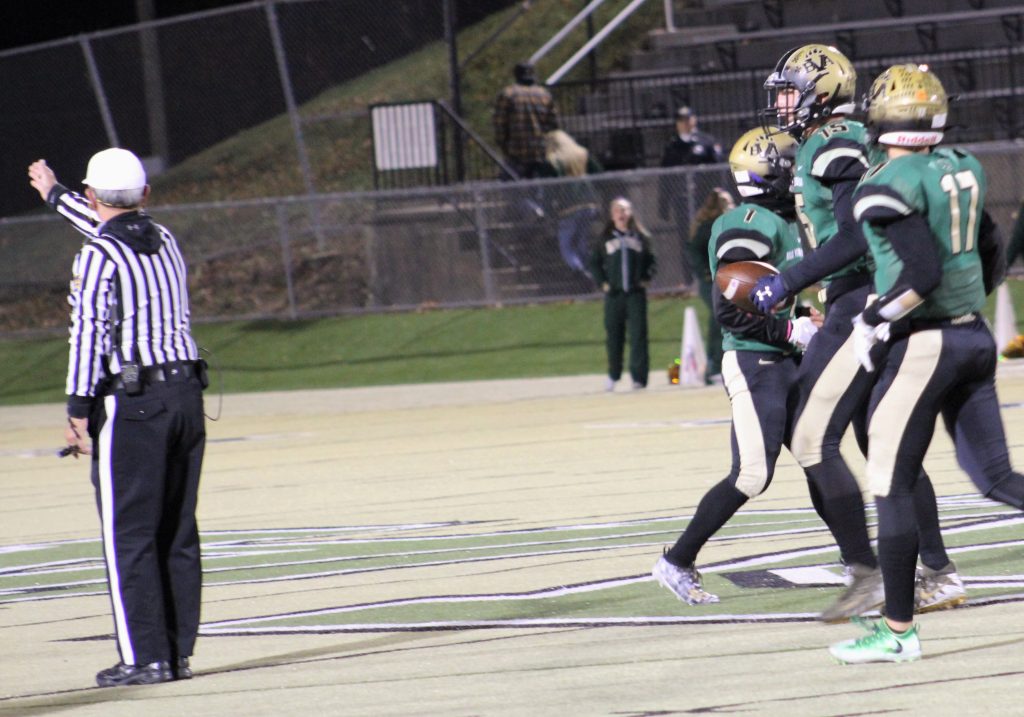 Cole Weightman recovered a McKnight fumble late in the first quarter and five plays later Hunter Ruokonen scored on a 39-yard touchdown pass from Jared Hartman early in the second quarter. Ruokonen caught a pass in the flat and broke two tackles before bouncing off of a defender on his way to the end zone.