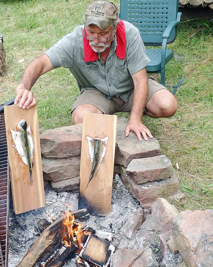 I saved some odd ends from the cedar boards we used for siding on the house. They impart a wonderful flavor that complements fish. I take a whole fish, gutted, and season with salt, pepper, and lemon, then spread it wide on the plank with the back of the trout, or “skin-side” up. Use tacks or fencing-staples to pin the fish to the plank. Just prop the plank a few feet from a campfire and let the fish broil until the juices run down across the wood and the skin browns. This method is a bit more “trouble” but the results are worth it. And thereĢƵ no cleanup; you can use the plank for your plate.
