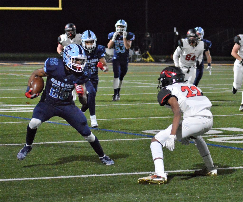 But the blue Warriors got on the board when they forced a fumble that was recovered by Justin Thompson at the EF 13 and Pitt recruit Stephon Hall scored from there on the next play.
