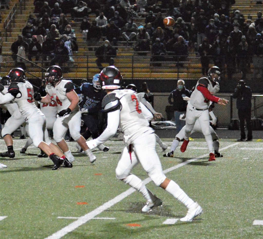 The third-seeded Warriors in white forced two punts in the opening quarter. Central Valley had only punted twice the entire season going into the game.