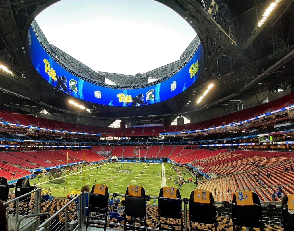 It was my first time at Mercedes Benz Stadium in Atlanta, and it is impressive. From its pinwheel retractable roof to the 58-by-1,100-foot ring-shaped video board around its ring, it is something else.