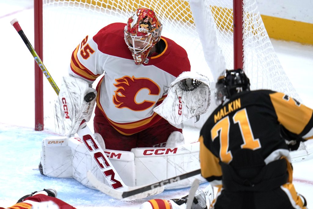 Pittsburgh Penguins' Evgeni Malkin (71) gets a shot past the blocker of Calgary Flames goaltender Jacob Markstrom (25) for a goal during the third period of an NHL hockey game in Pittsburgh, Saturday, Oct. 14, 2023.