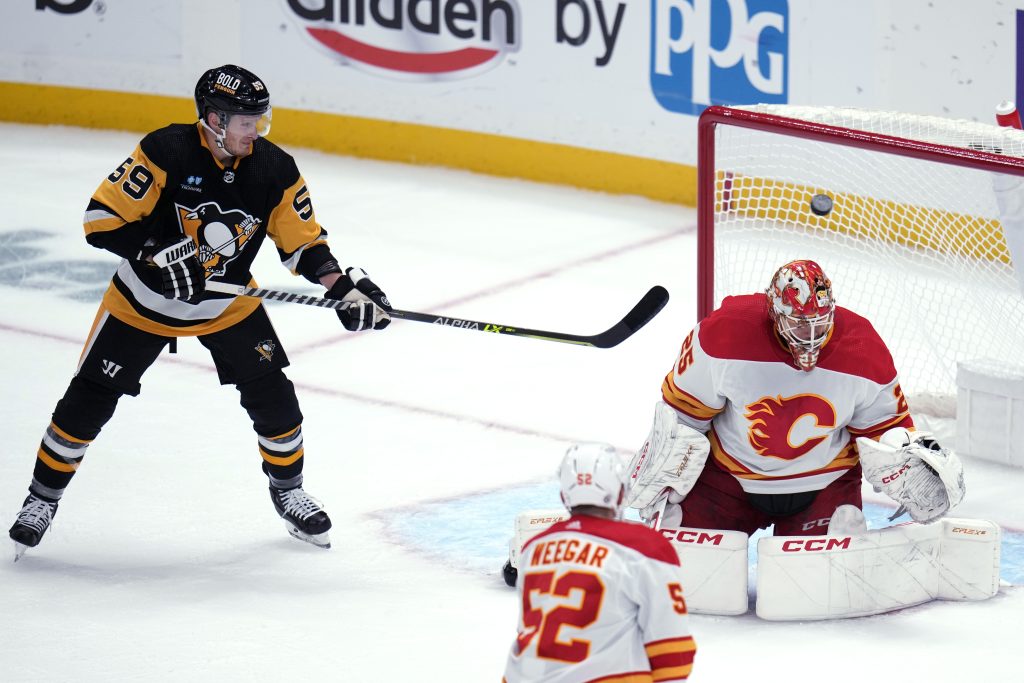 Pittsburgh Penguins' Jake Guentzel (59) can't get a shot past Calgary Flames goaltender Jacob Markstrom (25) during the first period of an NHL hockey game in Pittsburgh, Saturday, Oct. 14, 2023.