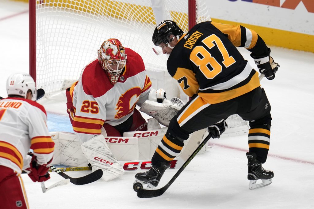 Pittsburgh Penguins' Sidney Crosby (87) gets off a pass in front of Calgary Flames goaltender Jacob Markstrom (25) during the first period of an NHL hockey game in Pittsburgh, Saturday, Oct. 14, 2023.