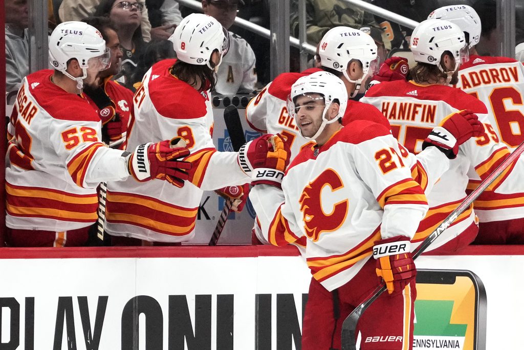 Calgary Flames' Matt Coronato (27) is congratulated for his goal against the Pittsburgh Penguins during the second period of an NHL hockey game in Pittsburgh, Saturday, Oct. 14, 2023.