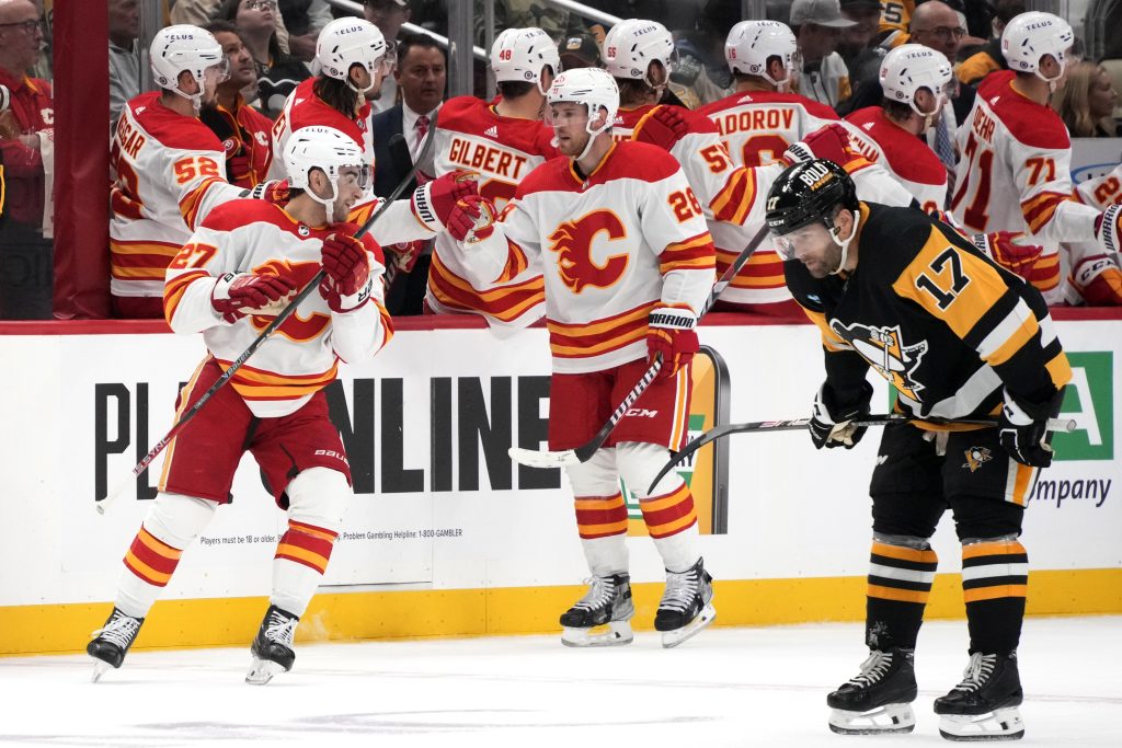 Calgary Flames' Matt Coronato (27) turns after celebrating his goal, while Pittsburgh Penguins' Bryan Rust (17) skates back to the bench during the second period of an NHL hockey game in Pittsburgh, Saturday, Oct. 14, 2023.