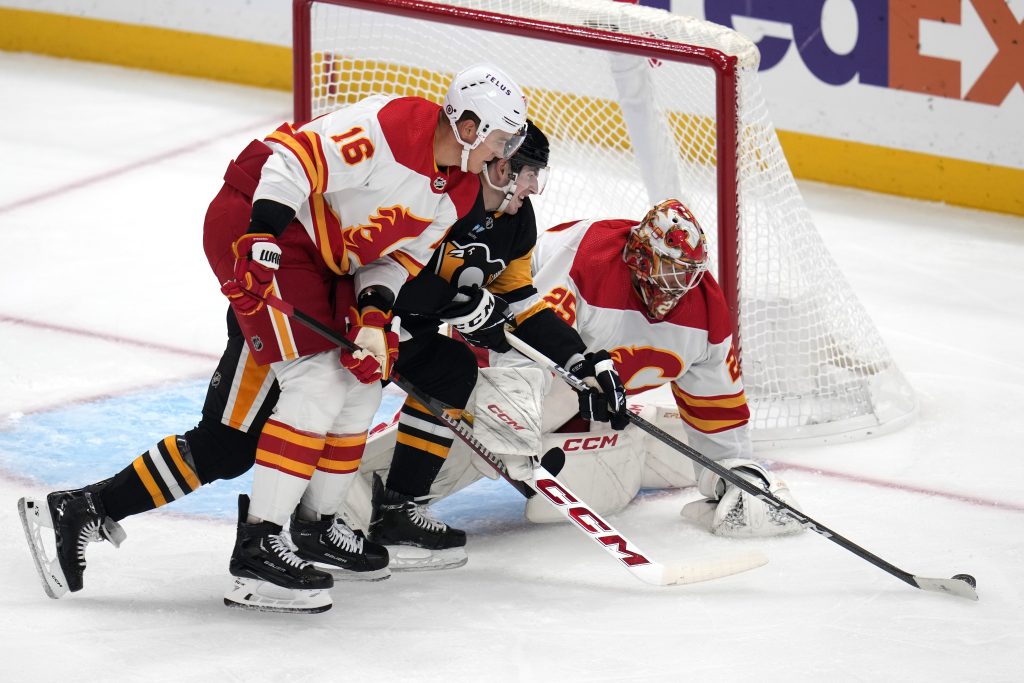 Pittsburgh Penguins' Drew O'Connor, center, can't get his stick on the puck in front of Calgary Flames goaltender Jacob Markstrom (25) with Nikita Zadorov (16) defending during the first period of an NHL hockey game in Pittsburgh, Saturday, Oct. 14, 2023.