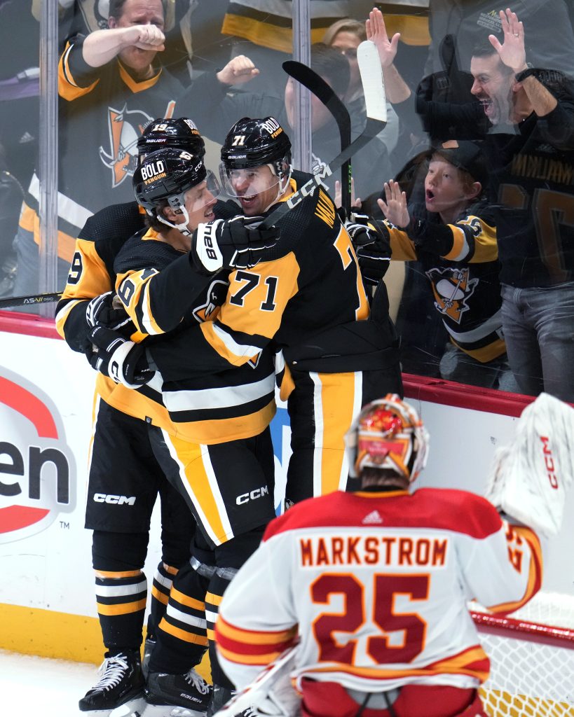 The Penguins’ Evgeni Malkin (71) celebrates his goal against the Calgary Flames with Rickard Rakell (67) during the third period Saturday at PPG Paints Arena.
