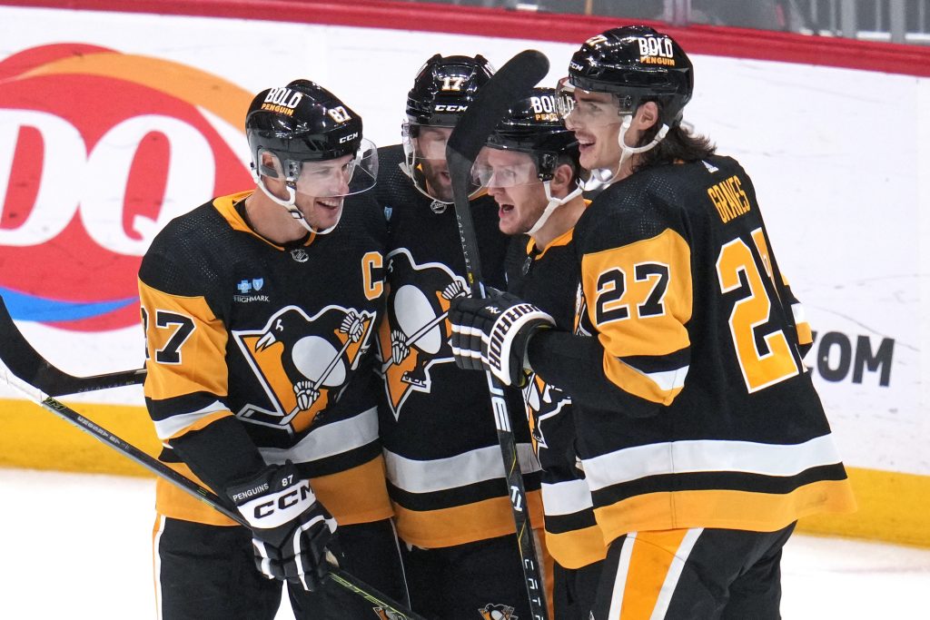 Pittsburgh Penguins' Jake Guentzel, second from right, celebrates with Ryan Graves (27), Bryan Rust (17) and Sidney Crosby (87) after scoring against the Calgary Flames during the third period of an NHL hockey game in Pittsburgh, Saturday, Oct. 14, 2023.