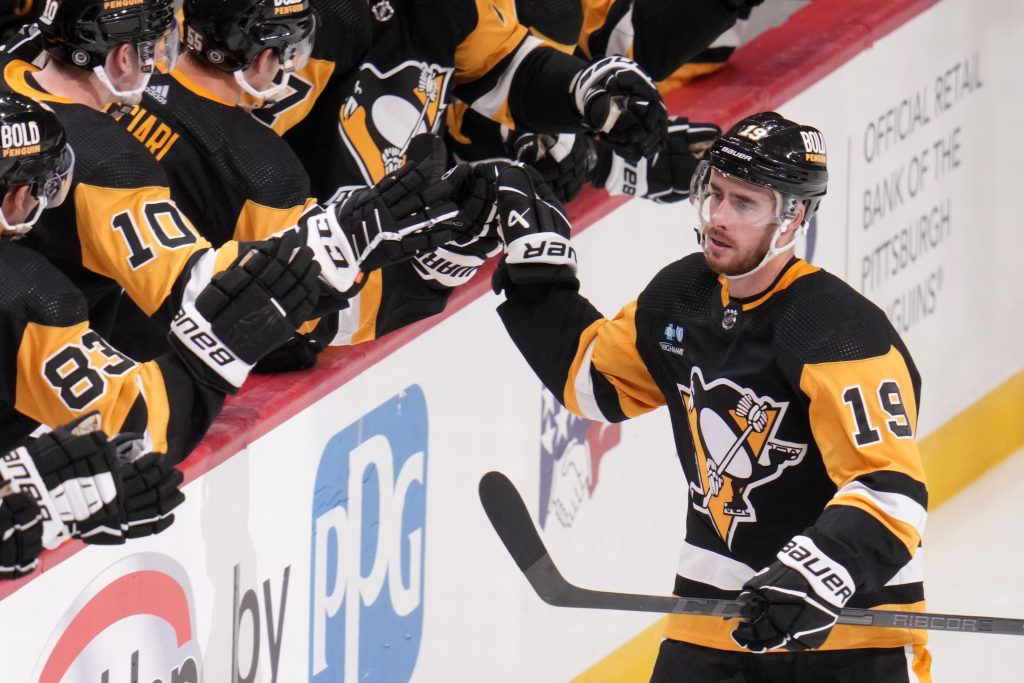 Pittsburgh Penguins' Reilly Smith (19) returns to the bench after scoring against the Calgary Flames during the third period of an NHL hockey game in Pittsburgh, Saturday, Oct. 14, 2023.