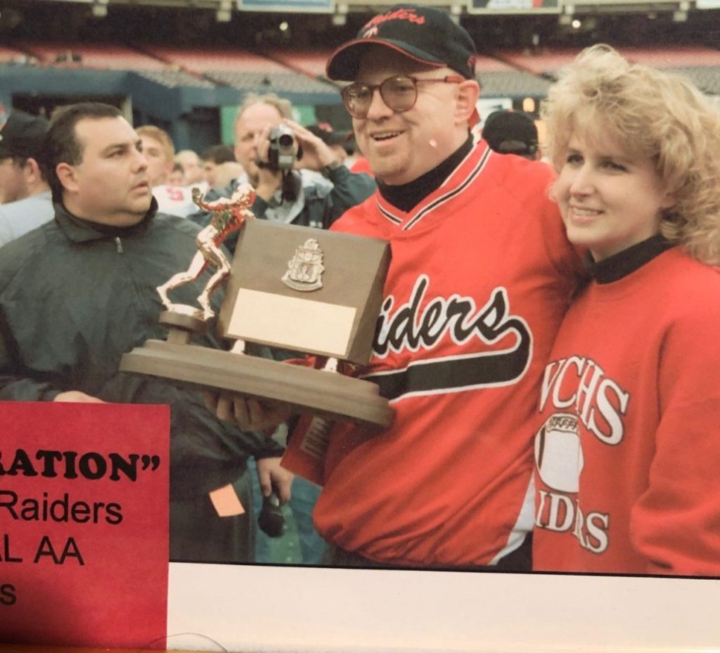 Waynesburg Central head coach Russ Moore holds the 1999 WPIAL Class AA football championship trophy after the Raiders defeated Washington, 30-3.