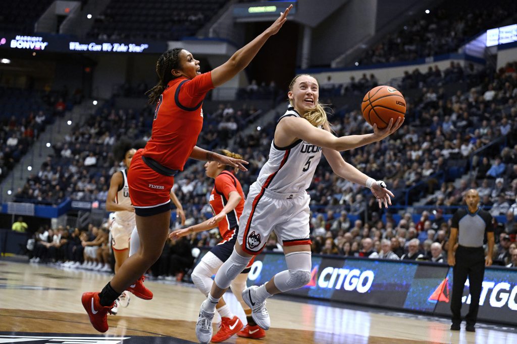 Ivy Wolf had 16 points to lead Dayton (0-1). The Flyers are coached by former UConn star Tamika Williams-Jeter, who won two national titles playing for the Huskies in 2000 and 2002