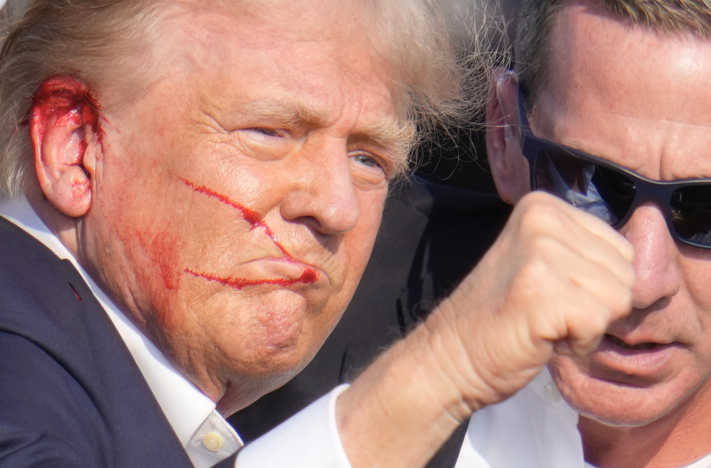 Trump got to his feet moments later and could be seen reaching with his right hand toward his face, streaked with blood. He then pumped his fist in the air and appeared to mouth the word “fight” twice, prompting cheers and chants of “USA. USA. USA.”