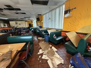 A Connellsville restaurant flooded Friday after sustaining significant damage to its roof.